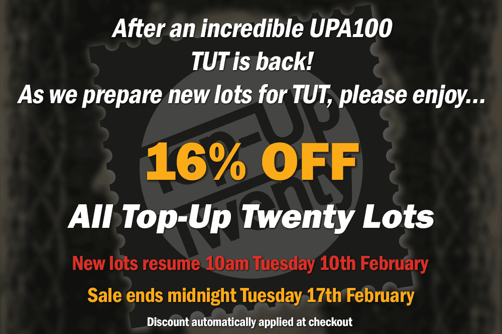 NEW UPA CUSTOMERS : TAKE YOUR 1st £55 ($73USD)FREE WHEN YOU SPEND £75+ (U$100+USD) OFFER VALID FOR NEW UPA CUSTOMERS ONLY, RESTRICTED TO ONE PER HOUSEHOLD, SUBJECT TO STATUS, TOP-UP TWENTY & AUCTION PURCHASES ONLY TO REDEEM: SELECT PRO-FORMA INVOICE AT THE CHECKOUT & ENTER "NEW CLIENT OFFER" IN THE EXTRA INFORMATION BOX, SO WE CAN SEND YOU A REVISED INVOICE