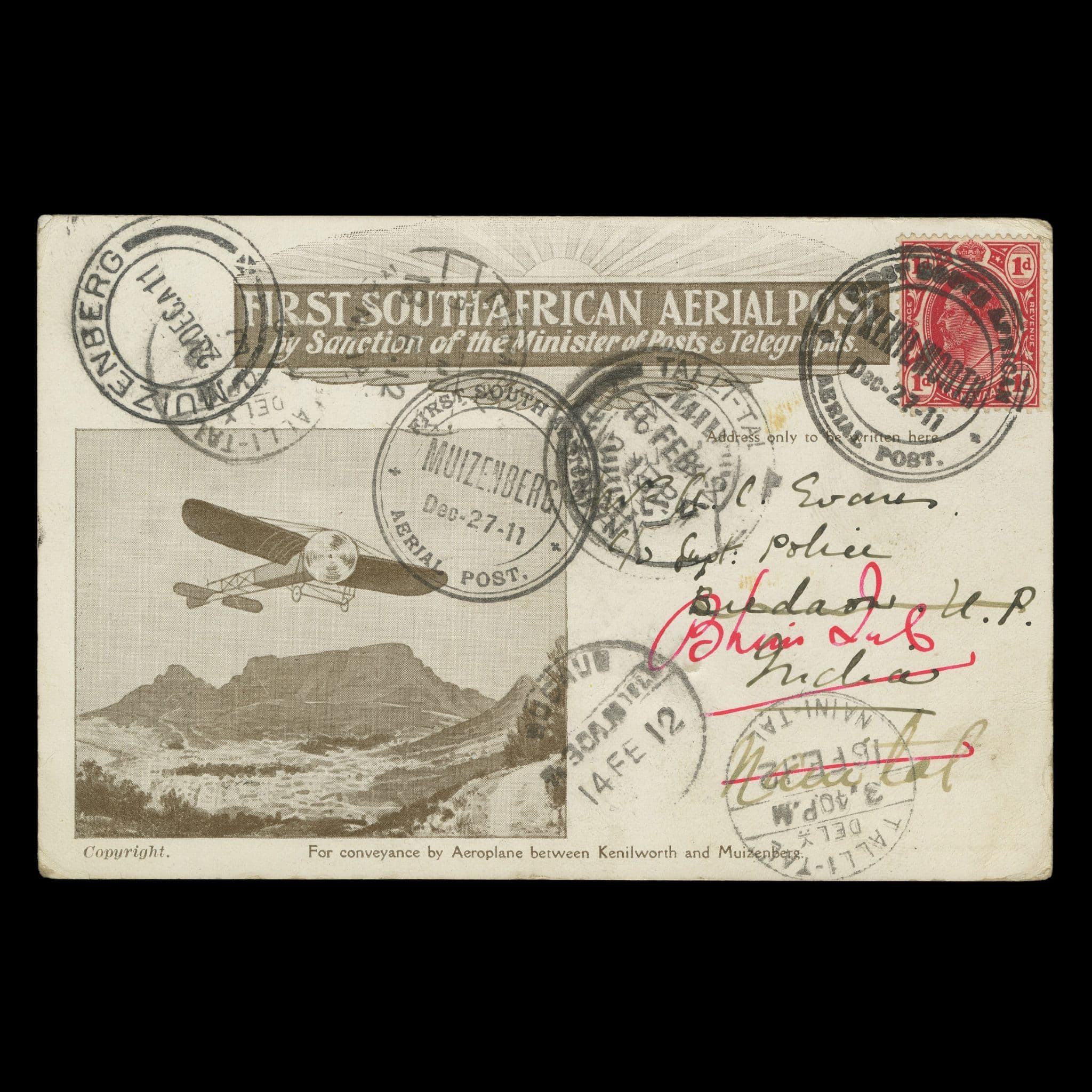 South Africa, 191127 December First Flight, Kenilworth-MuizenbergOfficial First Flight Souvenir Card to India, bearing Transvaal 1d. Red rate adhesive cancelled with "first south african/aerial post/kenilworth Dec-27-11" datestamp, superb arrival flight datestamp, Muizenberg (27.12) and 28/12 for onward transmission to INDIA 14 FE 12. A premium transit with entire journey cancels on the face of the card plus duplicate cancel reverse. Premium transit, some have realised up to £850. Fine condition (1 card) (UPA CERTIFICATE)