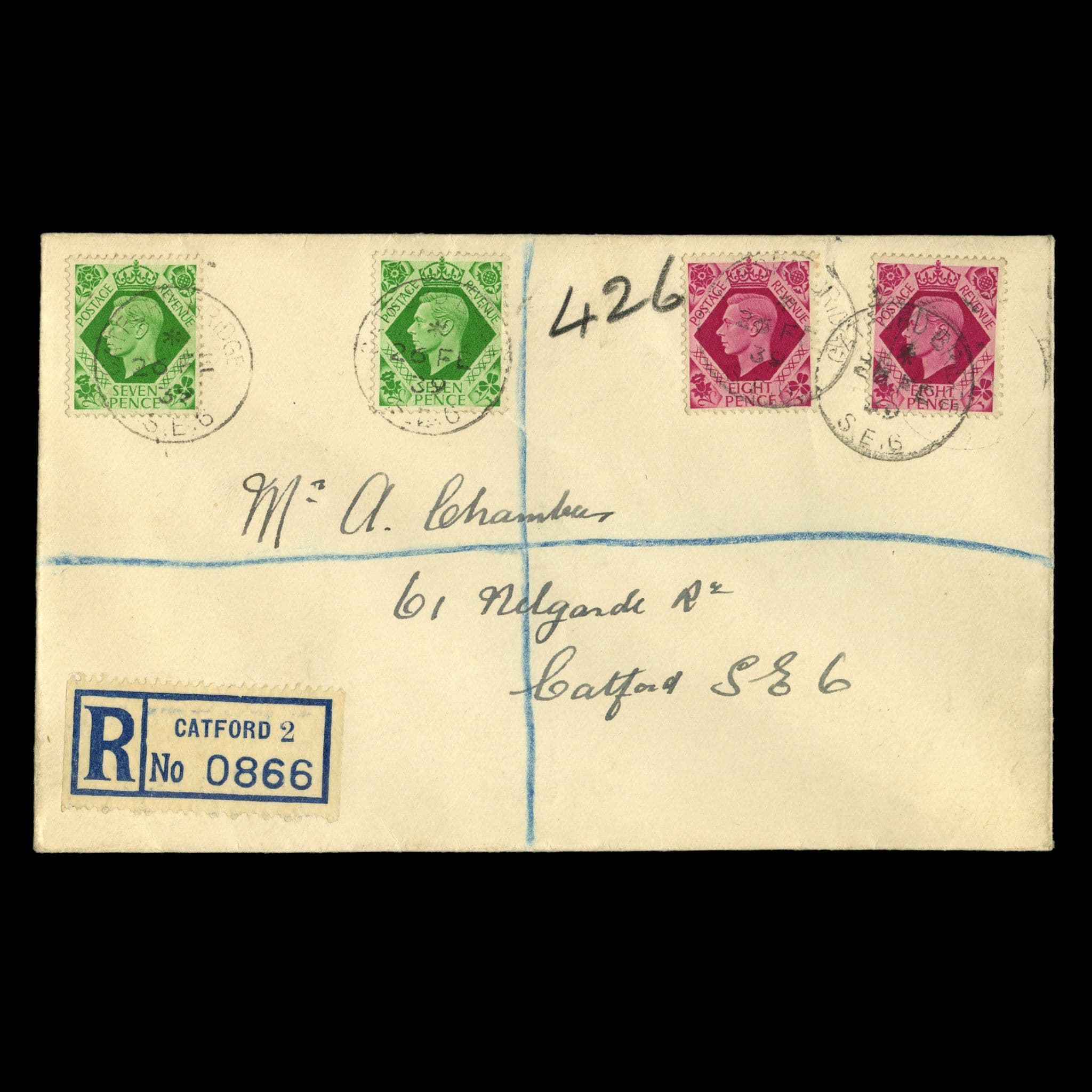 Great Britain - Covers - KGVI, 1939, SG471-472KGVI Unlisted One day Early 7d. Emerald-green & 8d. Bright Carmine superb condition CATFORD BRIDGE (Railway Station) REGISTERED etiquette neat small unopened cover bearing superfluous values with 2 x 7d. + 2 x 8d. Values, each neatly cancelled and backstamped 26 FE (19)39 ONE DAY before OFFICIAL DATE OF ISSUE 27 FE 39. Unlisted premature FDC, no mention in Booth, Bradbury or SG. Catalogued just £85 for one of each value on FDC, disregarding additional values and pre-Issue date First Day Cover. RARE? (1 cover) (UPA CERTIFICATE)