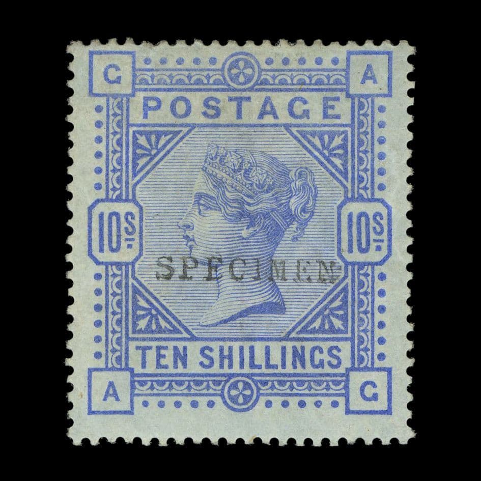 Great Britain - QV (surface printed), 1884, SG177aSQV 10s. COBALT on blued paper letters A-G, overprinted SPECIMEN Type 9, (SG Specialised K13 (2) t.) - exceptional fine fresh mint full original gum example, centred N, one fractionally short perf N., otherwise perforation well clear of design. Consistent paper bluing, wonderful fresh colour, well-positioned SPECIMEN clear profile. Stunning original gum. Catalogued £55,000= as normal - practical affordable, RARE in such fine condition. PREMIUM Example. Gem (1v.) (UPA CERTIFICATE)