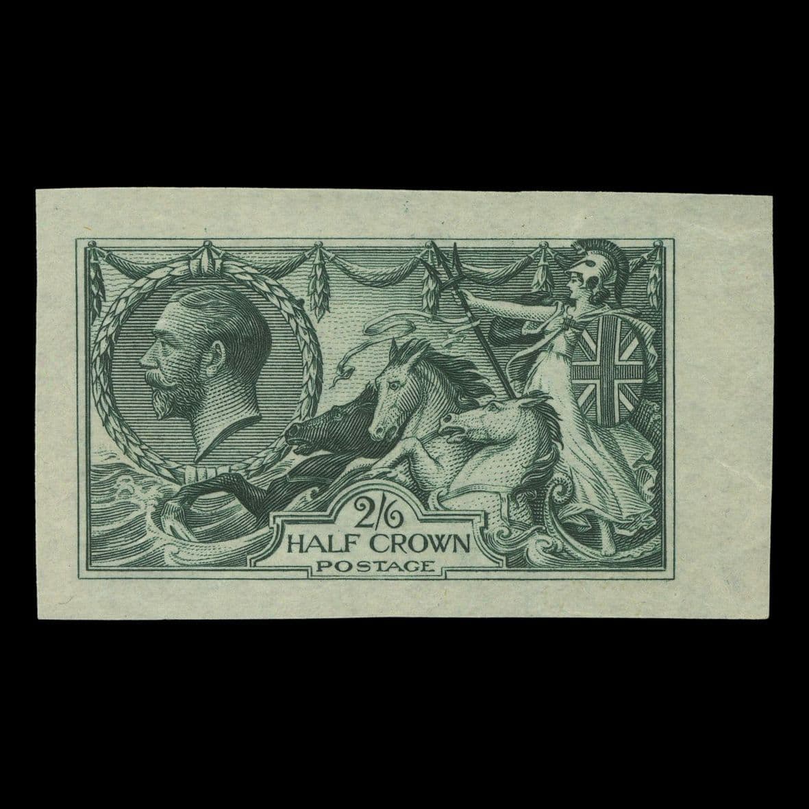 Great Britain - KGV, 1913, SG(400) TrialKGV Seahorse Waterlow Printing 2/6d. Colour Trial in Blue-Green - the colour for the issued £1. Blue-Green (mentioned in SG but not priced differently) seahorse high value, and therefore of especial relevance and significance - imperforate on thin ungummed unwatermarked wove paper (as per The Royal Philatelic Collection set of 19 different colours catalogued £5,500 each). Superb never hinged. Exceptionally RARE if not quite unique (1v.) (UPA CERTIFICATE)