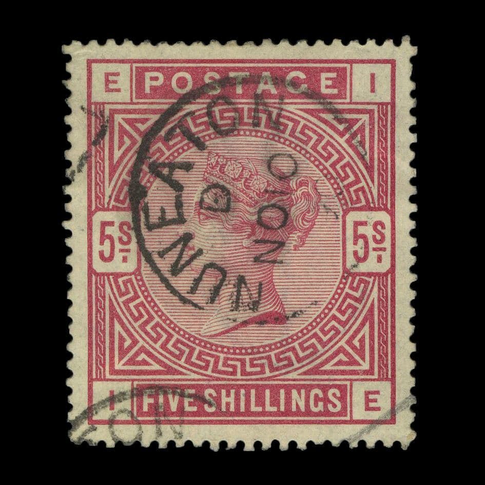 Great Britain - QV (surface printed), 1883-1884, SG180QV 5s. Rose, letters I-E, neat NUNEATON Socked on the Nose cds, minor paper creasing not affecting appearance, otherwise fine used. (1v.)